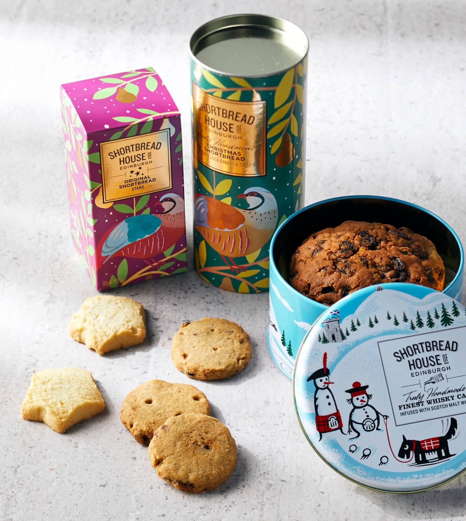 スコットランド名門のベーカリーの焼き菓子のコレクション。「ショートブレッドハウス・オブ・エディンバラ」(左から)星型ショートブレッド(100g)864円、クリスマスショートブレッド(200g)1,890円、ウイスキーケーキ(400g)3,240円